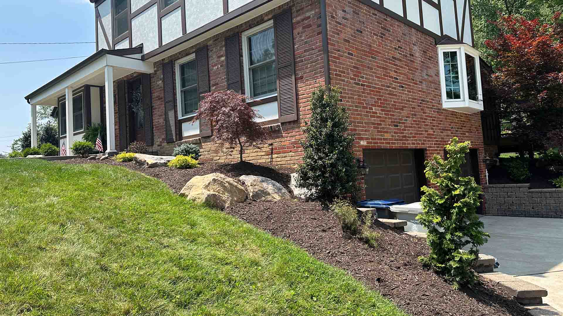 We removed the existing aged landscaping at this home and brought in a few big boulders. Some really nice pieces were utilized here with the Lady Dragon Holly on the corners of the house, a Weeping Japanese Maple, and a Hinoki Cypress.