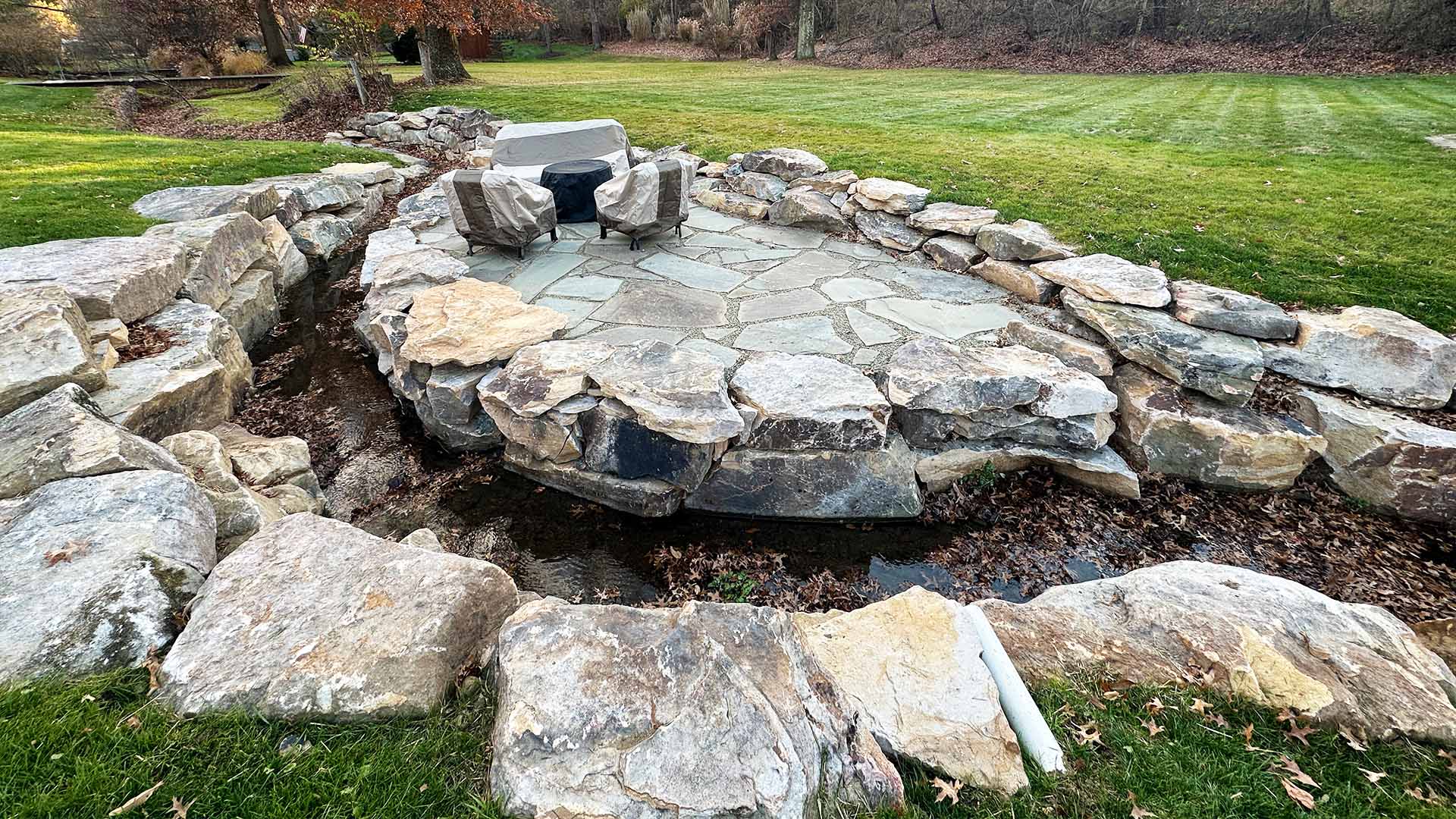This project consisted of lining the small creek with boulders and creating a raised flagstone patio.