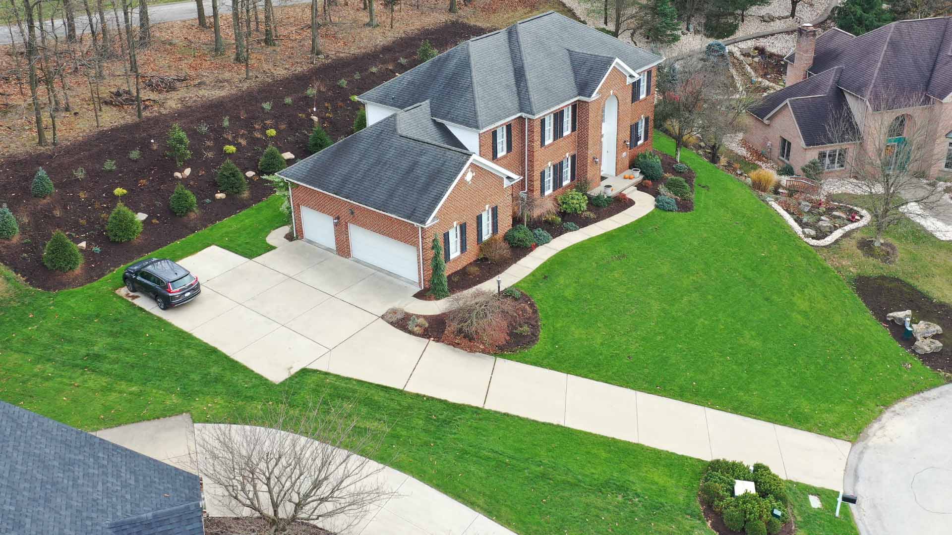 At this home in Peters Township we created a large landscape bed on the back hillside to both create visual interest and remove the need to cut the grass on the hillside. The entire front lawn was stripped out and replaced with new topsoil, seed, and manure.