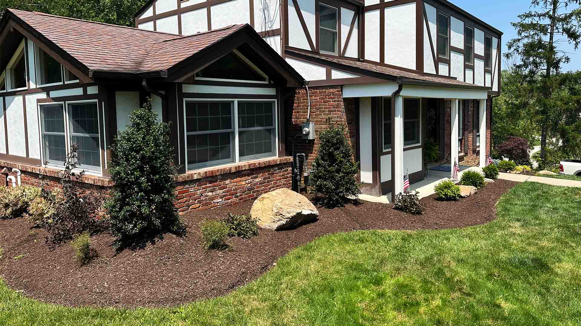 We removed the existing aged landscaping at this home and brought in a few big boulders. Some really nice pieces were utilized here with the Lady Dragon Holly on the corners of the house, a Weeping Japanese Maple, and a Hinoki Cypress.