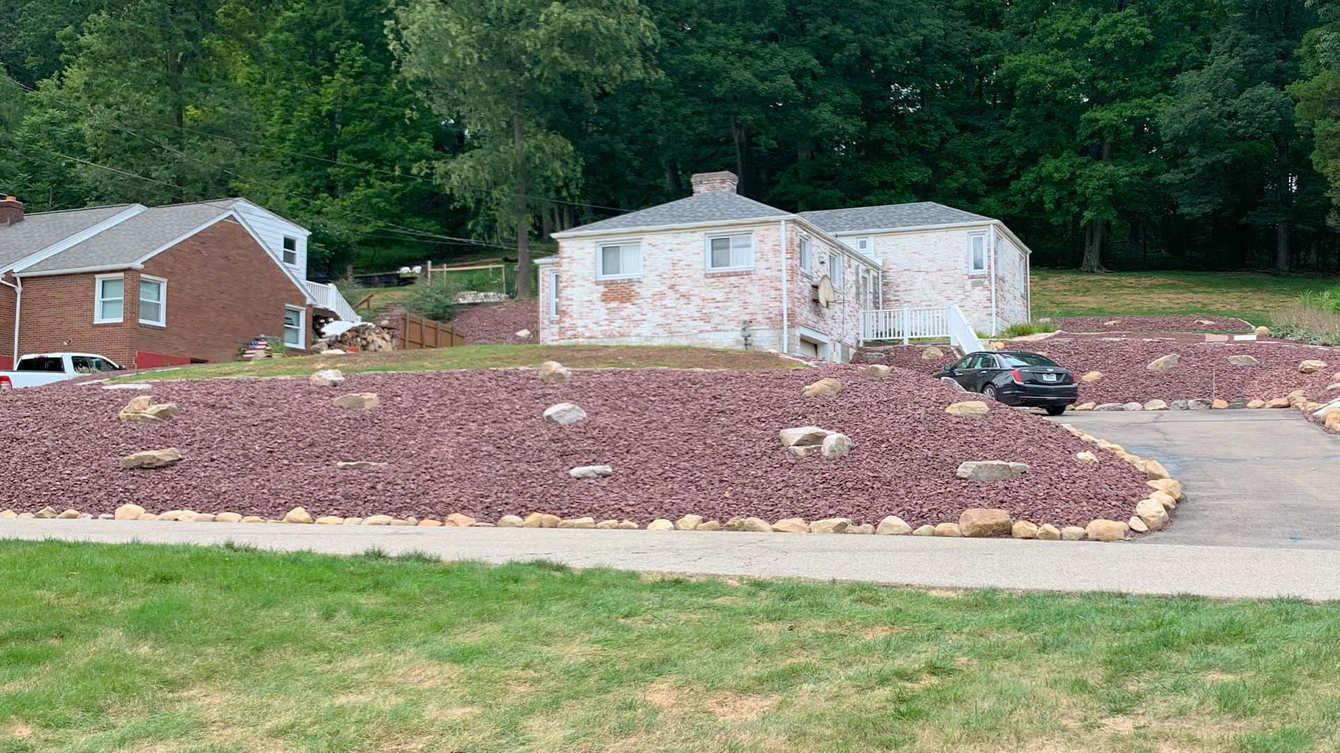 We removed all of the decaying evergreen ground cover and spread large red stone across the multiple levels of hillside on the property. The new stone landscape beds were then lined with Belgium Blocks and boulders were placed around the property.