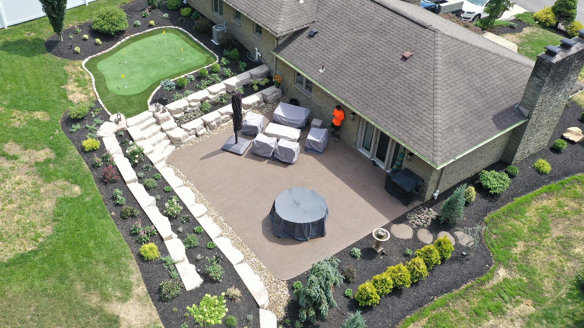 At this home in Bethel Park, we removed the existing patio and excavated the hillside further back to create more space. Rosetta Outcropping walls were installed with matching irregular steps leading up to the new putting green. We poured a large exposed aggregate patio and finished off the projects with lots of planting!