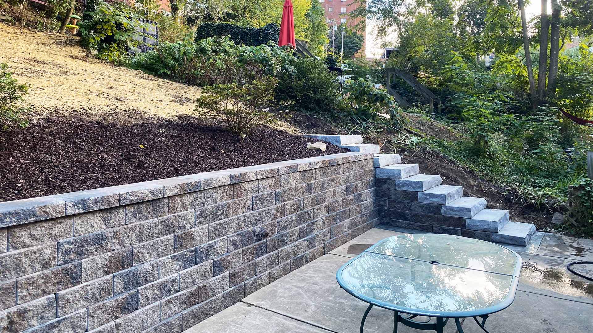 After securing the required permits, we removed and replaced the retaining wall in this extremely hard to get to Mt. Lebanon backyard after multiple other contractors left the home owner hanging. All of the material had to be taken out and brought in through the property above. We installed a Versa Lok wall and steps to access the upper backyard.